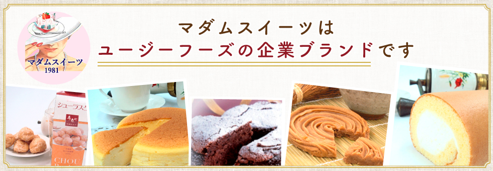 商品ページへマダムスイーツブランドは、1981年に生まれたユージーフーズの企業ブランドです。約30年以上愛され続けたマダムスイーツブランドは、シフォンロールやチーズケーキ、シューラスク等、様々なシーンや店舗で活躍するスイーツを取り揃えております。